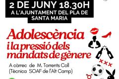 Sota el títol “Adolescència i la pressió dels mandats de gènere”, la sessió anirà a càrrec de M. Torrents Coll, tècnica del SOAF de l’Alt Camp, i oferirà una mirada profunda sobre les pressions socials i culturals que reben els nois i noies durant l’etapa adolescent en relació als estereotips de gènere. A través d’aquesta xerrada participativa, es reflexionarà sobre com els mandats socials influeixen en la manera com els joves viuen i expressen la seva identitat, emocionalitat i relacions.